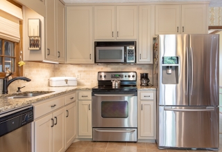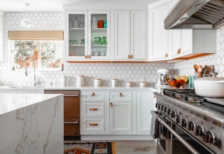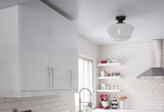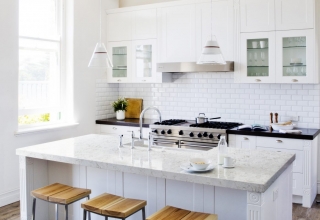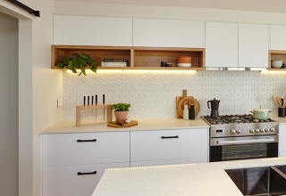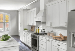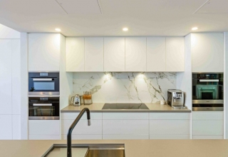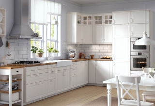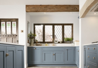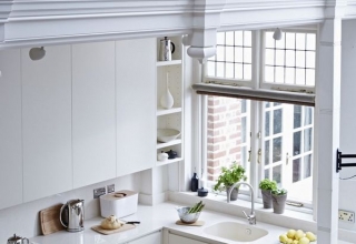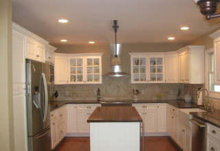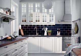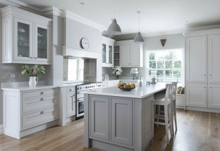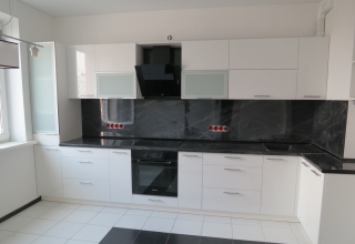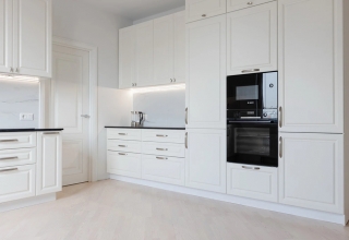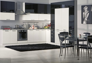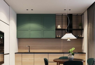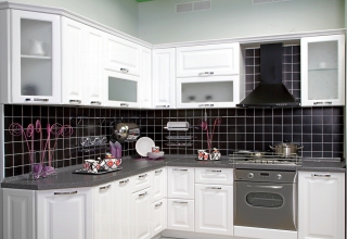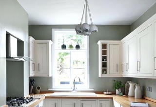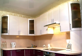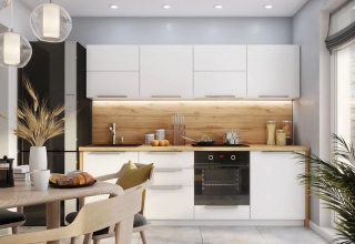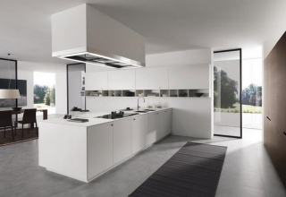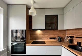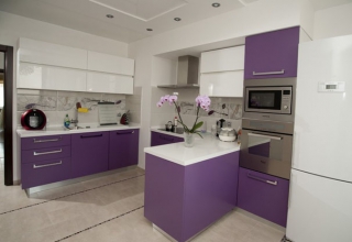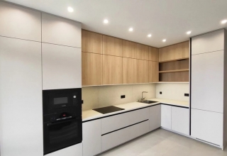 Кухня с фасадами из МДФ, покрытыми многослойной матовой эмалью, столешница из натурального дерева.